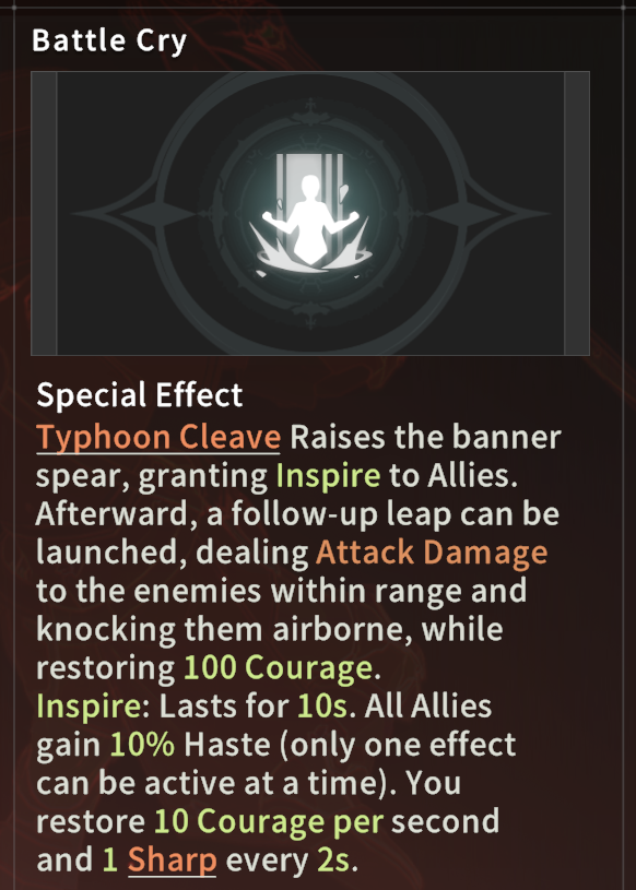 - 15 second buff that increase Courage regen and attack (via strength conversion), when activated the Courage bar will have a green outline around it.