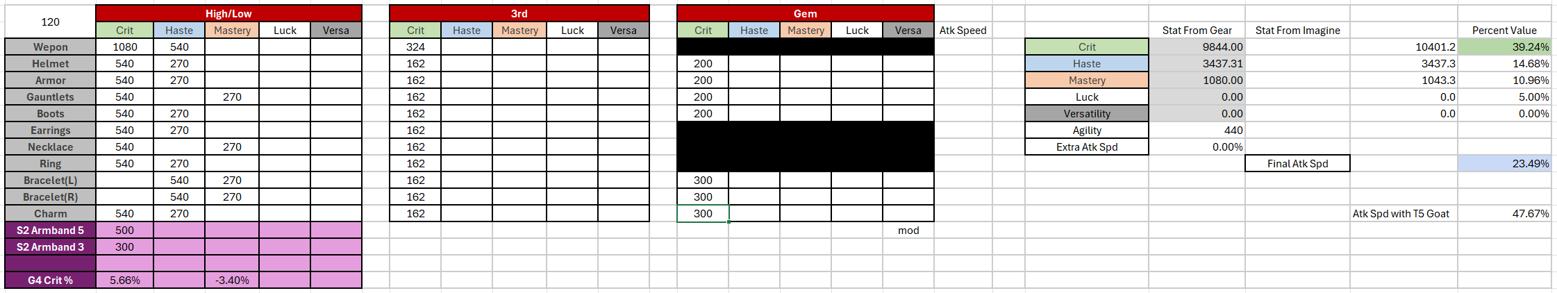 - Aim for mid 50s to low 60s attack speed, and the rest into crit while keeping a small amount of stat in both mastery and versatility (~10%).